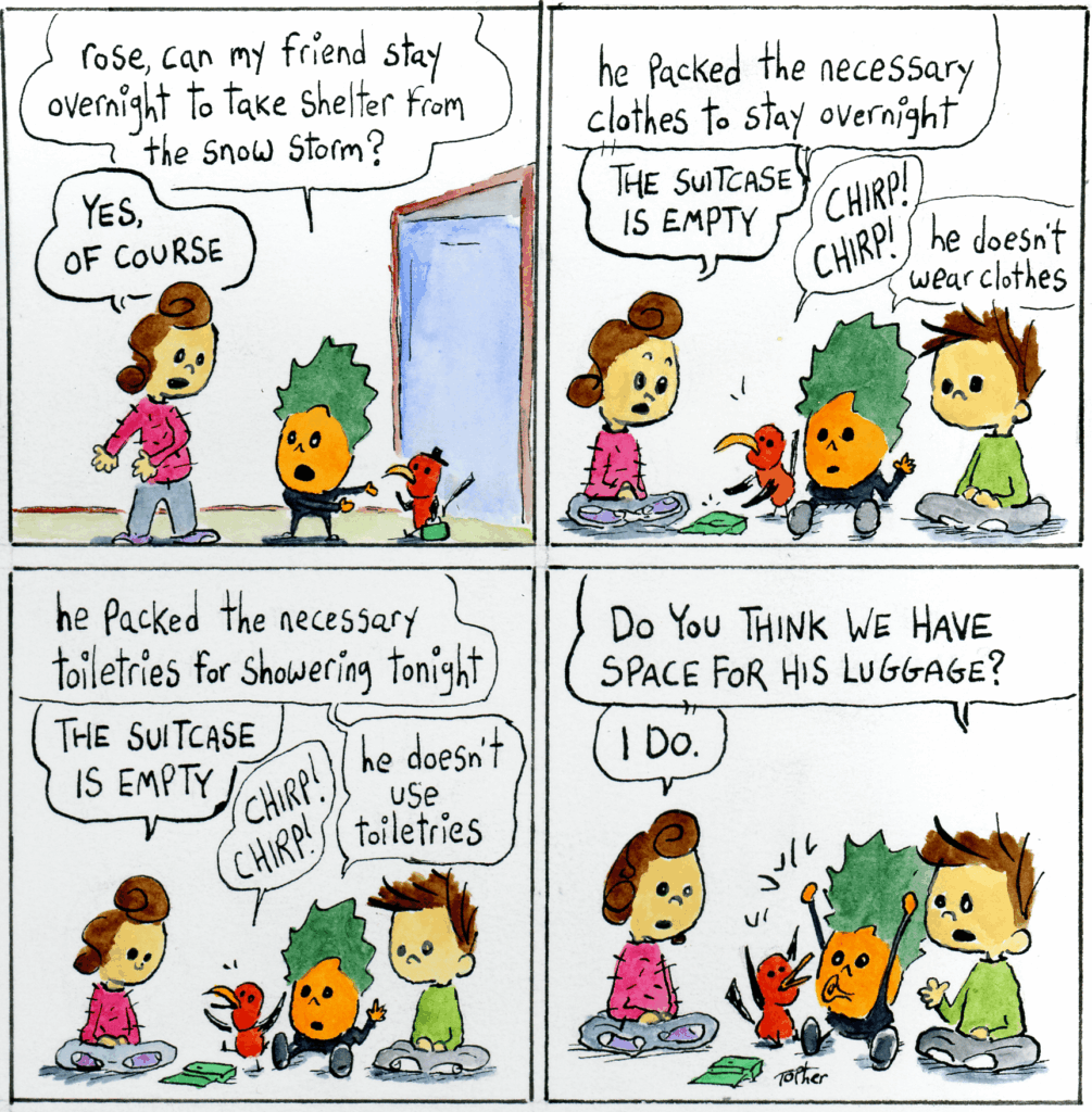 Comic strip starring Andrew, Rose, and Patricia the Pineapple
